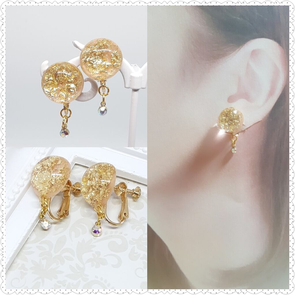 丸いチャームの中にはゴールドのラメが散りばめられています。クリスタルオーロラがキラキラ揺れるイヤリングです!