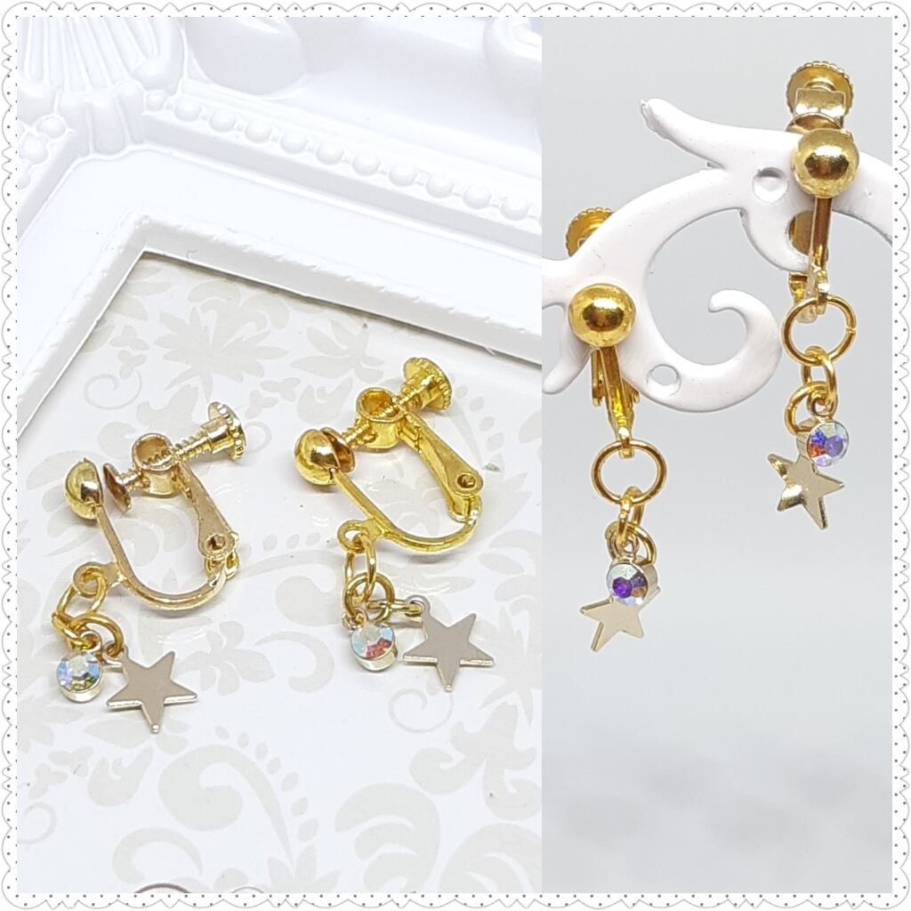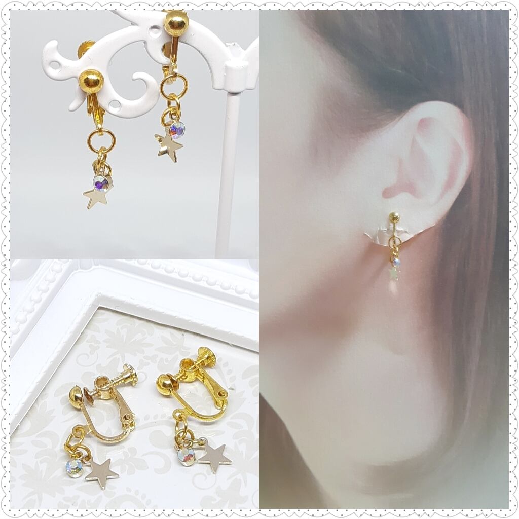 クリスタルオーロラと星のチャームがキラキラ揺れるイヤリングです!