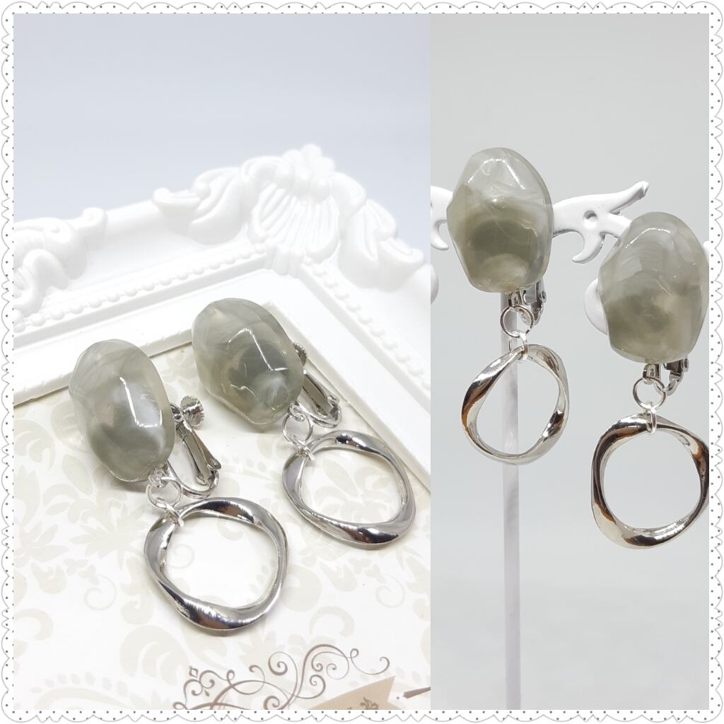 変形フープとグレーのカボションの組み合わせがクールな印象のデザインです!